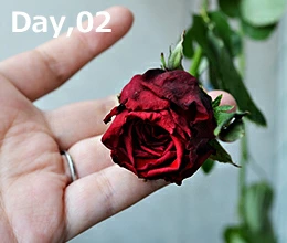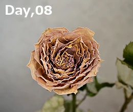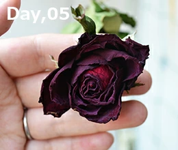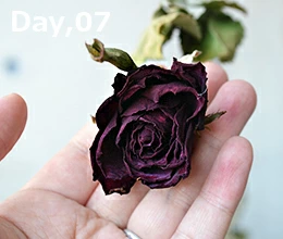 2日目よりもさらに水分が抜けて、花が縮んで小さくなった感じがする。外側の花弁は黒くなって